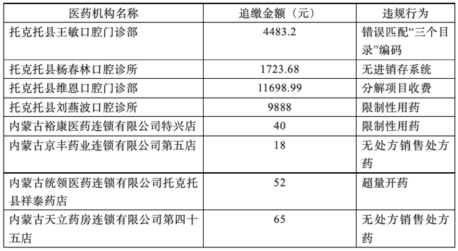 为规范定点医药机构服务行为,维护基金安全,我局对全县定点医药机构职工门诊统筹协议履行情况开展了一季度日常监管,发现部分定点医药机构存在错误匹配“三个目录”编码、无处方销售处方药、无进销存系统等违规情况,依据《呼和浩特市本级定点零售药店医疗保障服务协议》、《呼和浩特市职工基本医疗保险定点医疗机构门诊医疗服务协议》的规定,涉及违规费用27968.87元,现对职工门诊统筹协议履行情况有违规行为的定点医药机构进行通报,各定点医药机构要引以为戒,主动规范自身经营行为,严格遵守医保相关规定,坚决抵制各类欺诈骗保违法、违规行为,共同守护好参保群众的“看病钱”“救命钱”。维护医保基金安全事关你我,人人有责,如发现欺诈骗保行为,请及时向我县医保部门举报。举报电话:0471-8566284
