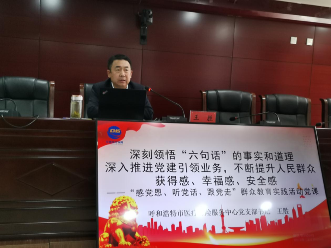 为深入学习贯彻习近平新时代中国特色社会主义思想,全面贯彻党的二十大精神,以铸牢中华民族共同体意识为主线,引导市医保中心党员干部群众深刻认识“六句话”的事实和道理,3月29日,呼和浩特市医疗保险服务中心党支部书记王胜为全体党员干部群众作题为《深刻领悟“六句话”的事实和道理,深入推进党建引领业务,不断提升人民群众获得感、幸福感、安全感》——“感党恩、听党话、跟党走”党课宣讲。