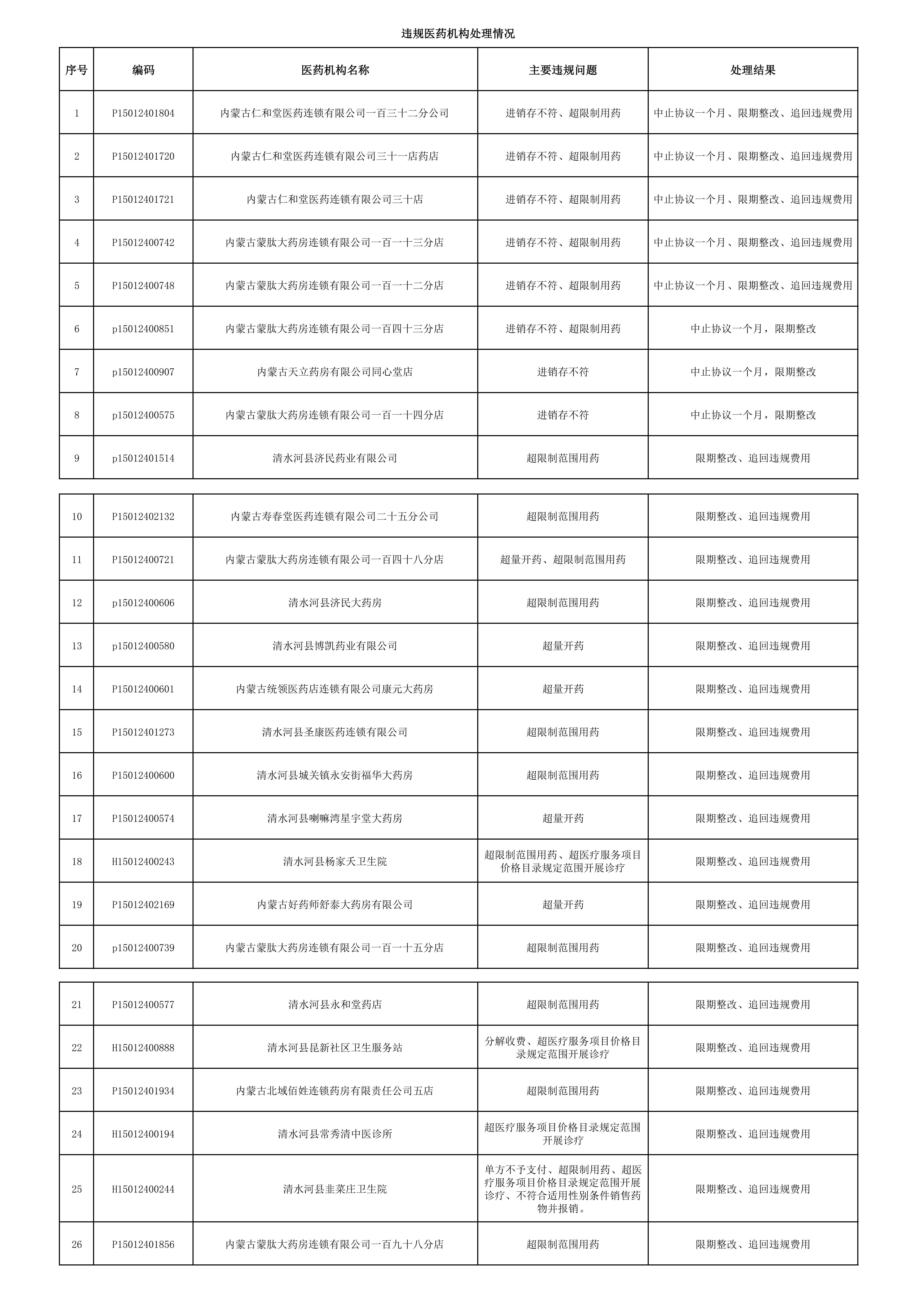 检查发现相关医药机构存在超限制范围用药、不符合适用性别销售药物并报销、超量开药、药品进销存不符、超医疗服务项目价格开展诊疗等违规问题,涉及违规基金49.11万元。按照《医疗机构医疗保障定点管理暂行办法》(国家医疗保障局令第2号)、《零售药店医疗保障定点管理暂行办法》(国家医疗保障局令第3号)、《呼和浩特市定点医疗机构医疗保障服务协议》《呼和浩特市定点零售药店医疗保障服务协议》等相关规定,清水河县医保局对存在问题医药机构分别作出中止协议、限期整改、追回违规基金等处理。具体处理情况通报如下: